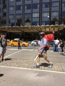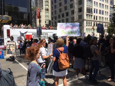 The Impeachment March was actually a rally in front of trump’s international hotel at Columbus Circle. It was a small rally, but enthusiastic. There was chanting and cheering and the thumbs up and peace signs from the tourists that rode the tops of the double-decker buses as they drove by (okay, they mostly took pictures of us), and the honking of horns in support from taxi drivers and just those driving up Central Park West. There was one lone trump supporter with his trump 2020 flag at first until a handful of creepy white guys with a seemingly out of place darker skinned young woman just following them around, showed up. I left long before the end so other than making an uncomfortable presence, I don’t know if they had anything else in mind.