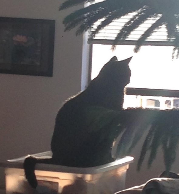 This would be Max checking out the sunset the other evening that’s reflected in the windows of the building across the highway. He’s actually facing east. And yes, I have a tree in my apartment. His name is Tree and he has an interesting story to tell that goes back more than 30 years. Tree has been sporting my bowler hat for the past couple of months, and is looking so dashing in it that in honor of recently passed Patrick Macnee, aka John Steed, it will remain there indefinitely.
