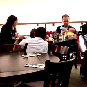 And then there is Alberto, who takes very good care of me. I don’t know if he’s a good man or not, but he is the goodest waiter. The pictures – that’s Alberto delighting a table of three young women last week, and conversing with a little boy this morning.
